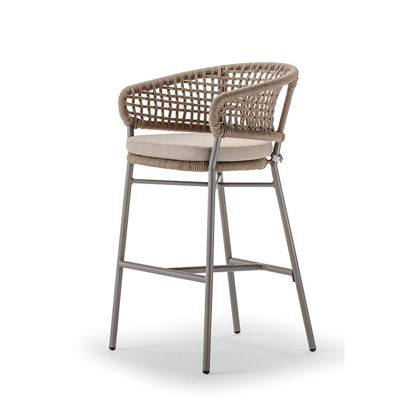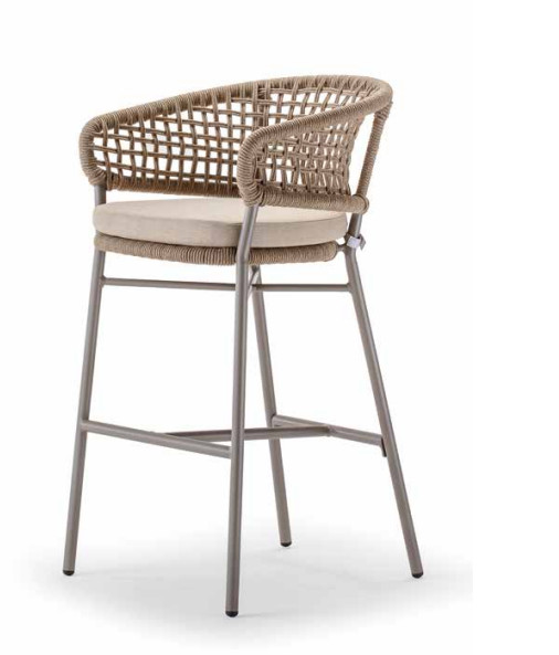 A bárszék szintetikus kötéllel borított kialakítása stílusos megjelenést és kényelmes alátámasztást nyújt. Az Olefin szövettel készült párnák vízlepergetők és könnyen tisztíthatók, míg a gyorsan száradó habszivacs komfortos ülést biztosít akár nedves környezetben is.